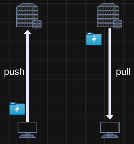 Basicamente empujar(PUSH) es enviar los archivos desde nuestro equipo hacia un destino y jalar(PULL) es traernos los archivos desde un destino hacia nuestro equipo.